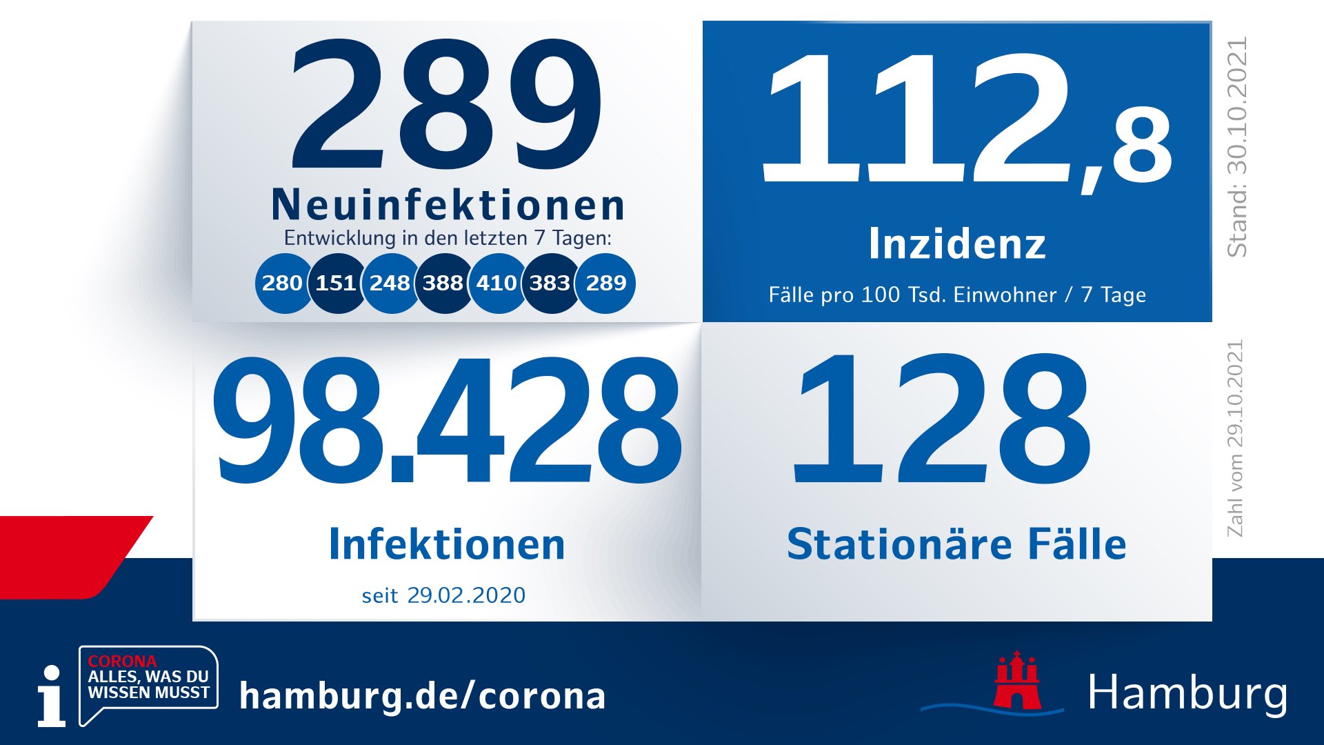 Corona-Briefing KW 44 Zahlen und Einschätzungen zu Infektionsgeschehen und Schutzimpfungen. In den letzten 7 Tagen wurden in Hamburg 2134 Fälle registriert die 7-Tage-Inzidenz. Nach Angaben der Sozialbehörde sind Montag 332 neue Corona-Fälle in Hamburg. Nachrichten zum Thema Coronavirus.